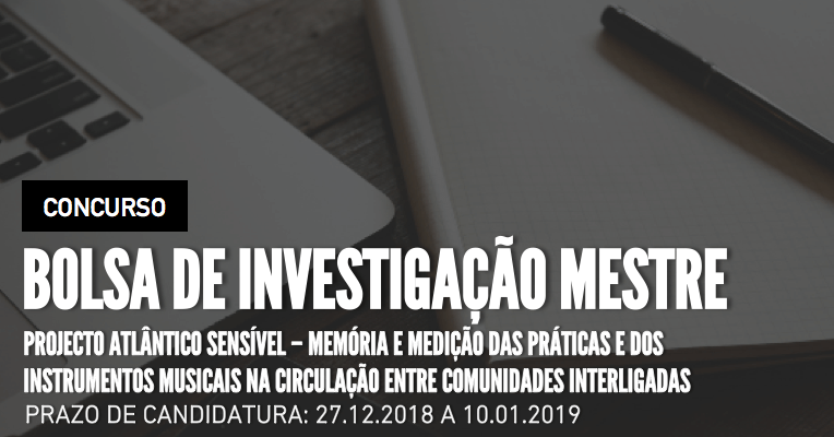 Encontra-se aberto concurso para a atribuição de uma Bolsa de Investigação – Mestre, no âmbito do projeto POCI-01-0145-FEDER-031812 designado AtlaS (Atlântico Sensível – Memória e mediação das práticas e dos instrumentos musicais na circulação entre comunidades interligadas), financiado pelo Programa Operacional de Competitividade e Internacionalização, na sua componente FEDER, e financiado por fundos nacionais, através da Fundação para a Ciência e Tecnologia. Áreas Científicas: Tecnologias da Informação e Comunicação / Música / Antropologia O concurso encontra-se aberto no período de 27 de dezembro de 2018 a 10 de janeiro de 2019.