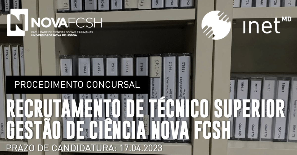 Encontra-se aberto o procedimento de recrutamento, com vista à contratação de um Técnico Superior, em regime de contrato de trabalho a termo resolutivo incerto, para exercer funções na sede do Instituto de Etnomusicologia – Centro de Estudos em Música e Dança | NOVA FCSH.