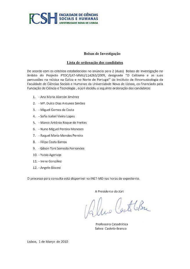 De acordo com os critérios estabelecidos no anúncio para 2 (duas) Bolsas de Investigação no âmbito do Projecto PTDC/EAT-MMU/114263/2009, designado “O Celtismo e as suas percussões na música na Galiza e no Norte de Portugal” do Instituto de Etnomusicologia da Faculdade de Ciências Sociais e Humanas da Universidade Nova de Lisboa, co-financiado pela Fundação de Ciência e Tecnologia, o júri decidiu a seguinte ordenação dos candidatos: