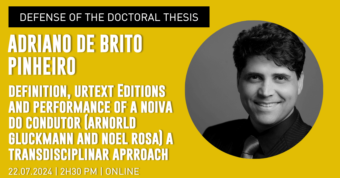 The Defense of the Doctoral Thesis in Music for Adriano de Brito Pinheiro will be held via videoconference (Isabel Maria de Oliveira Alcobia) on July 22nd, 2024, at 2:30 pm. The topic is “Definition, Urtext Edition and Performance of A Noiva Do Condutor (Arnold Gluckmann And Noel Rosa) A Transdisciplinary Approach.“