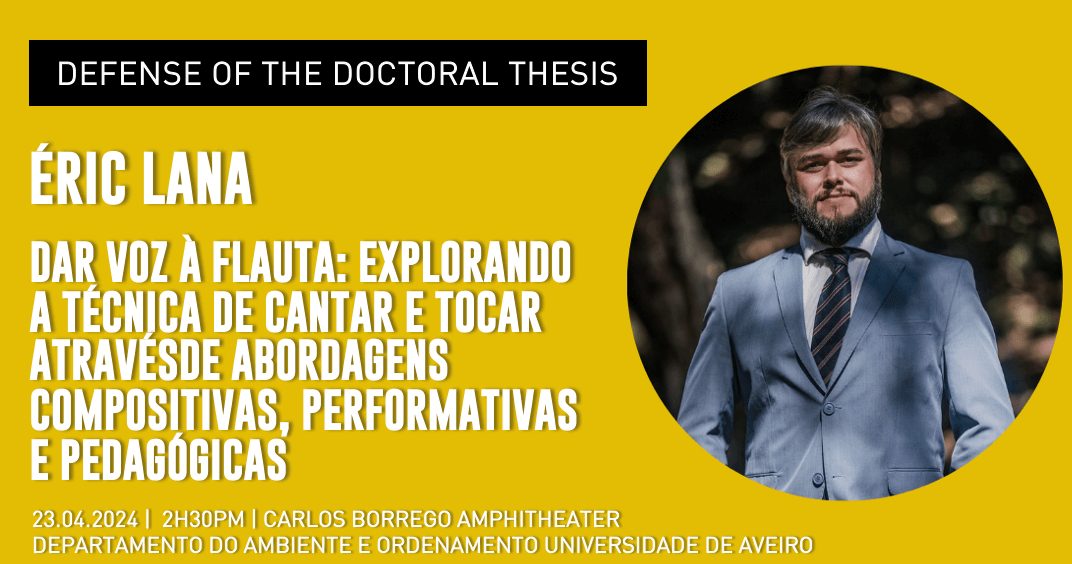 On April 23rd, 2024, at 2h30pm, the defense of the doctoral thesis in Music, by Éric Vinícius de Aguiar Lana, will be held at the Carlos Borrego Amphitheatre, Departamento do Ambiente e Ordenamento Universidade de Aveiro, with the theme: “Práticas de Direção em Coros Infanto Juvenis: Abordagens Pedagógicas e Recursos M-Learning“.