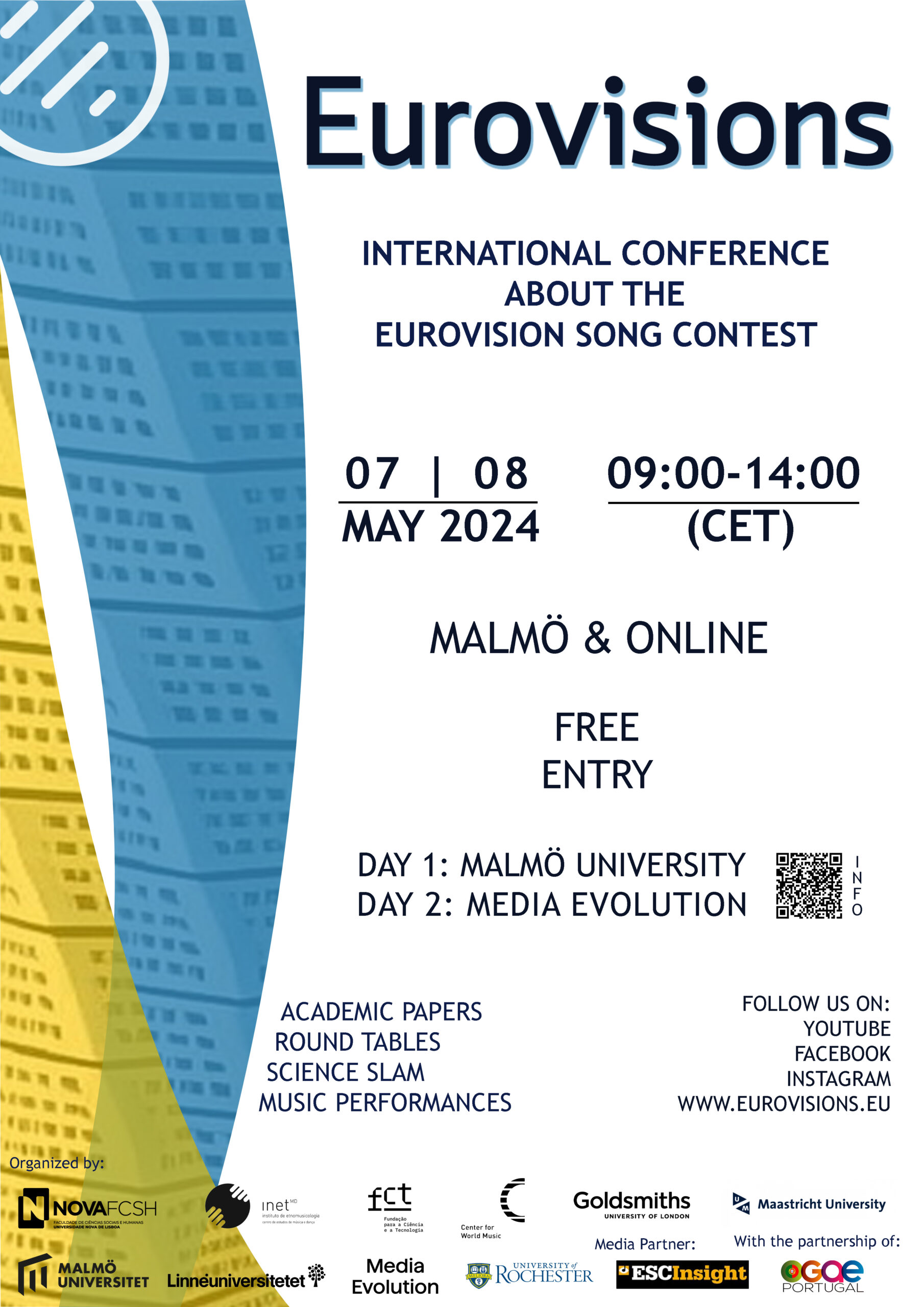 This year, the EUROVISIONS conference will take place in the week of the semi-finals of the Eurovision Song Contest (ESC): on May 7 th , 09:00-14:00 (CEST), in the Niagara building of the Faculty of Culture and Society at Malmö University and on Wednesday May 8 th , 09:00–13:00 (CEST), at Media Evolution City in Malmö. It will once again embrace a hybrid format, welcoming participants both onsite in Malmö and online through our YouTube and social media channels.