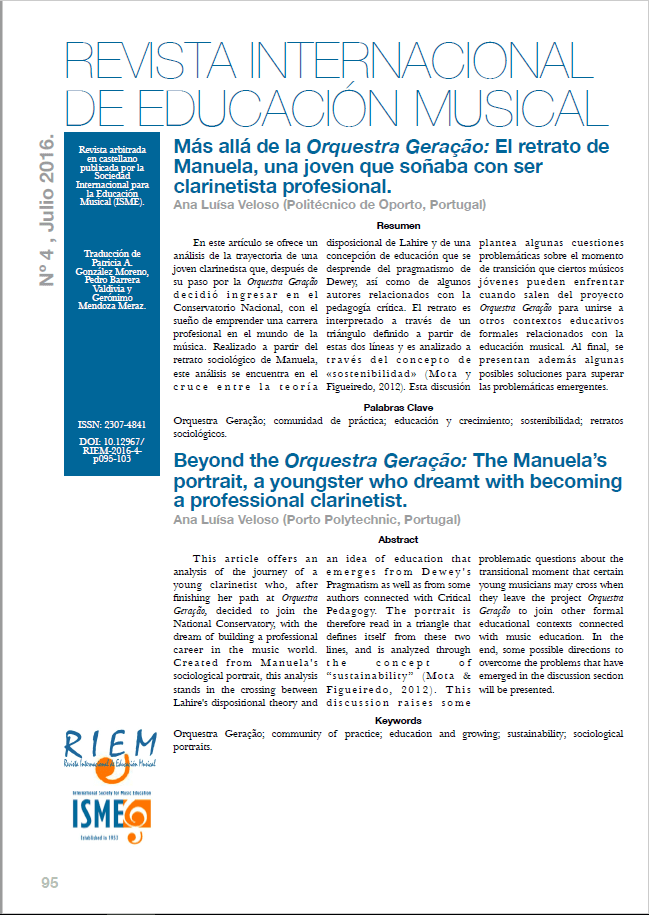 Ana Luísa Veloso (2016). “Más allá de la Orquestra Geração: El retrato de Manuella, una joven que soñaba com ser clarinetista profesional” in Revista Internacional de Educación Musical, n.º 4, pp.25-33.