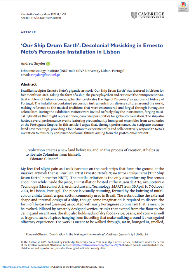 Andrew Snyder, integrated researcher at INET-md, author the article “Our Ship Drum Earth: Decolonial Musicking in Ernesto Neto’s Percussion Installation in Lisbon“, published in open access in the journal Twentieth-Century Music.