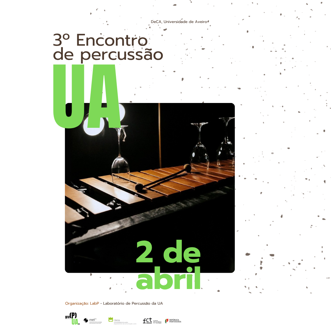 No dia 2 de abril, o Departamento de Comunicação e Arte (DeCA) da Universidade de Aveiro (UA) recebe o 3.º Encontro de Percussão, organizado pelo LabP – Laboratório de Percussão da UA, com o apoio do Instituto de Etnomusicologia – Centro de Estudos em Música e Dança (INET-md). Este evento procura proporcionar aos estudantes de percussão um espaço de apresentação, de reflexão e discussão sobre temas relevantes nesta área. A entrada é livre e não requer inscrição.