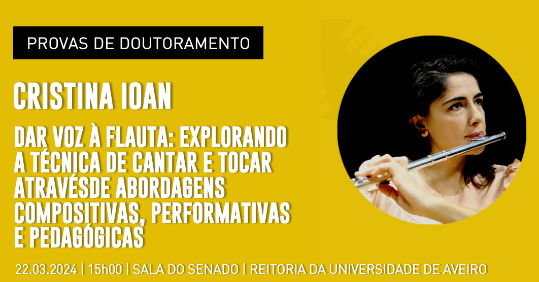 Realizam-se na Sala do Senado, na Reitoria da Universidade de Aveiro, a 22 de março de 2024, pelas 15:00 as provas do Programa Doutoral em Música, de Cristina Ioan, com o tema “Dar Voz à Flauta: Explorando a Técnica de Cantar e Tocar Através de Abordagens Compositivas, Performativas e Pedagógicas”.