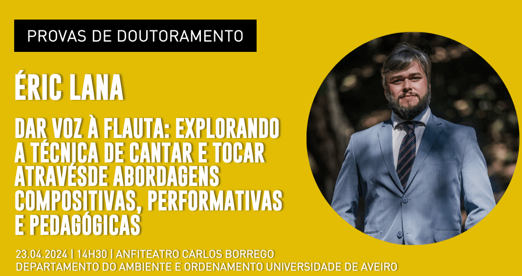 Realizam-se no Anfiteatro Carlos Borrego, Departamento de Ambiente e Ordenamento, Universidade de Aveiro, a 23 de abril de 2024, pelas 14h30, as provas do Programa Doutoral em Música, de Eric Vinícius de Aguiar Lana, com o tema: “Práticas de Direção em Coros Infanto Juvenis: Abordagens Pedagógicas e Recursos M-Learning”.