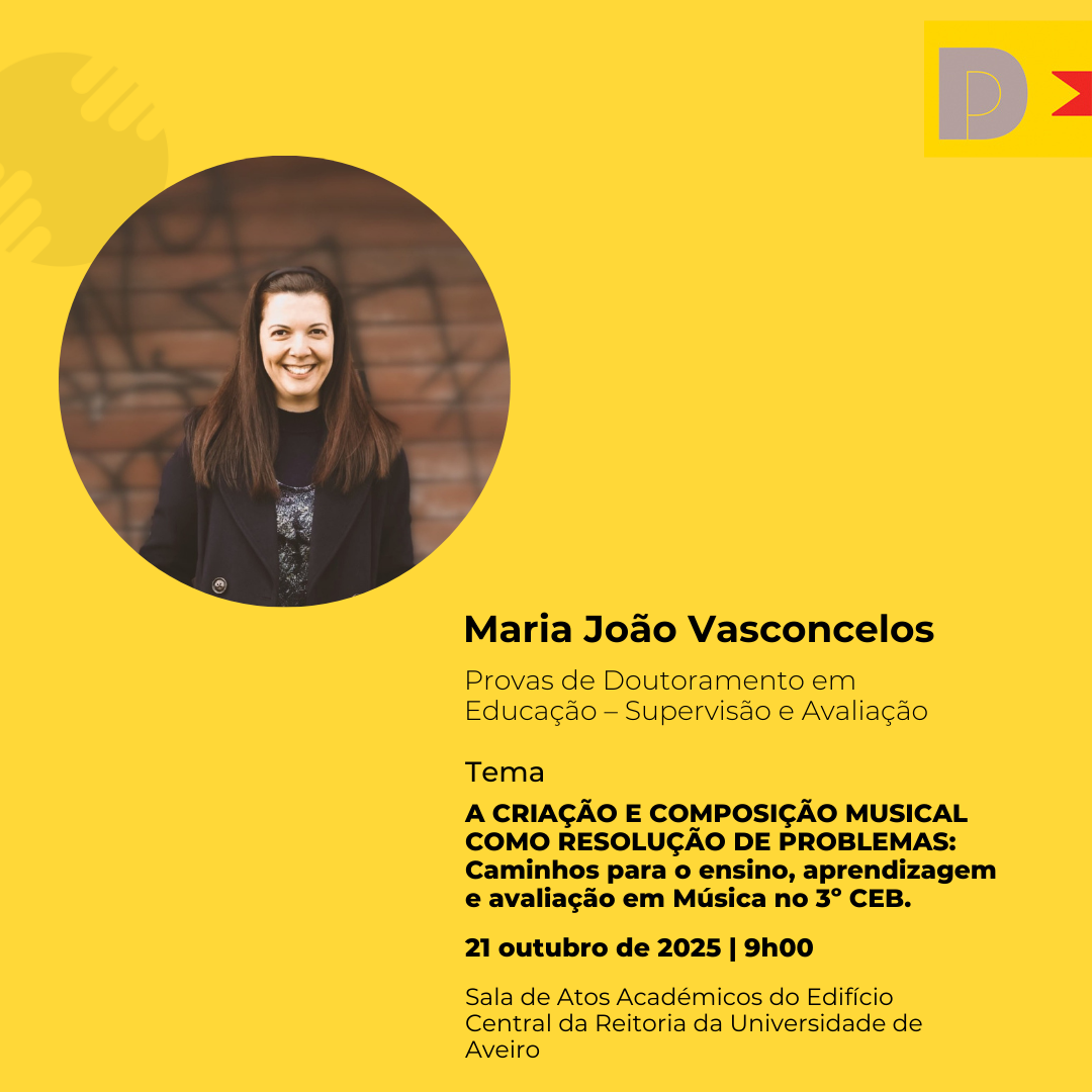 A 21 de outubro de 2025, pelas 9h30, decorrem as provas de doutoramento em Educação – Supervisão e Avaliação (tese acolhida pelas unidades de investigação INET-md e CIDTFF) da Mestre Maria João Pinto de Vasconcelos Lopes, que defenderá a sua dissertação com o título A CRIAÇÃO E COMPOSIÇÃO MUSICAL COMO RESOLUÇÃO DE PROBLEMAS: Caminhos para o ensino, aprendizagem e avaliação em Música no 3º CEB.