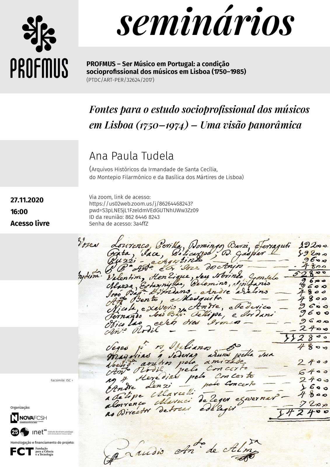 “Fontes para o estudo socioprofissional dos músicos em Lisboa (1750-1974) – Uma visão panorâmica”, por Ana Paula Tudela (Arquivos Históricos da Irmandade de Santa Cecília, do Montepio Filarmónico e da Basílica dos Mártires de Lisboa) integra ciclo de seminários do projecto PROFMUS – Ser Músico em Portugal: a condição socioprofissional dos músicos em Lisboa (1750-1985), financiado pela FCT (PTDC/ART-PER/32624/2017). Acesso livre via zoom