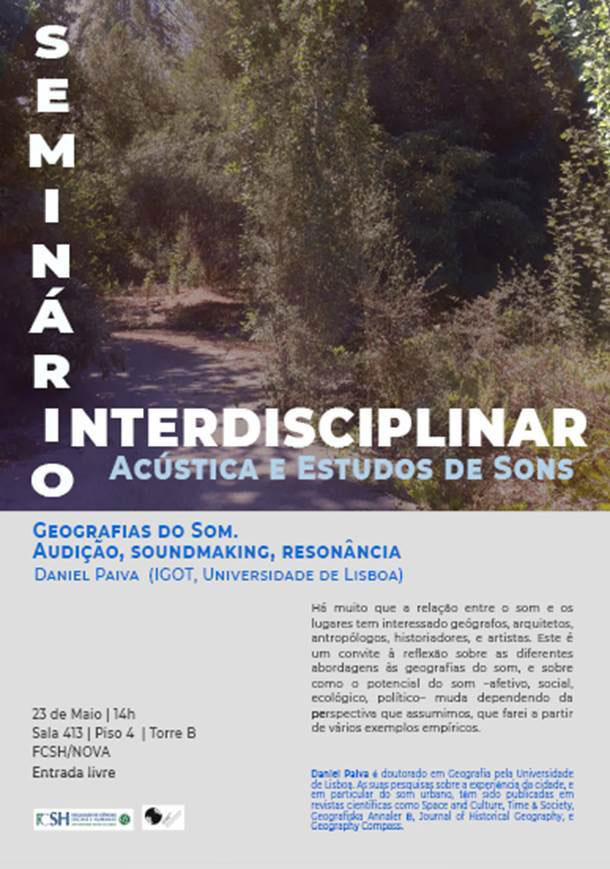 Há muito que a relação entre o som e os lugares tem interessado geógrafos, arquitetos, antropólogos, historiadores, e artistas. Este é um convite à reflexão sobre as diferentes abordagens às geografias do som, e sobre como o potencial do som – afetivo, social, ecológico, político – muda dependendo da perspectiva que assumimos, que farei a partir de vários exemplos empíricos.