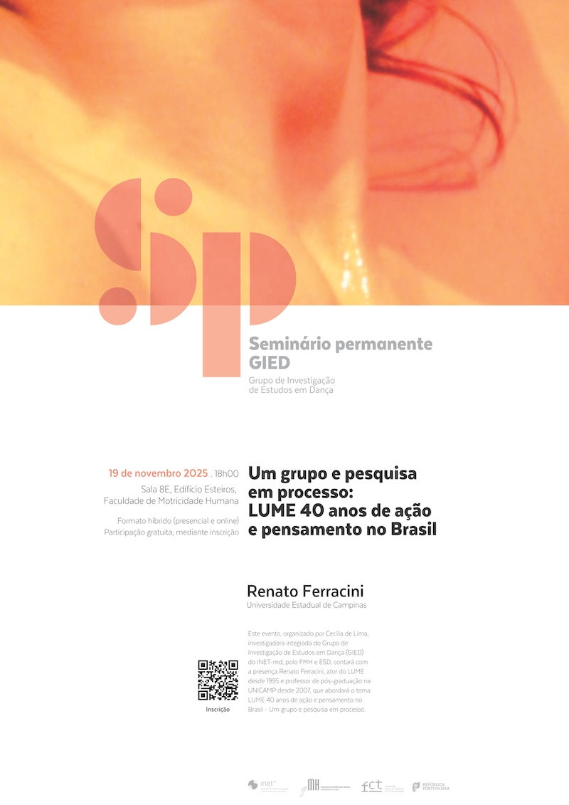 Este evento, organizado por Cecília de Lima, investigadora integrada do Grupo de Investigação de Estudos em Dança (GIED) do INET-md, polo FMH e ESD, contará com a presença Renato Ferracini, ator do LUME desde 1995 e professor de pós-graduação na UNICAMP desde 2007, que abordará o tema LUME 40 anos de ação e pensamento no Brasil – Um grupo e pesquisa em processo.