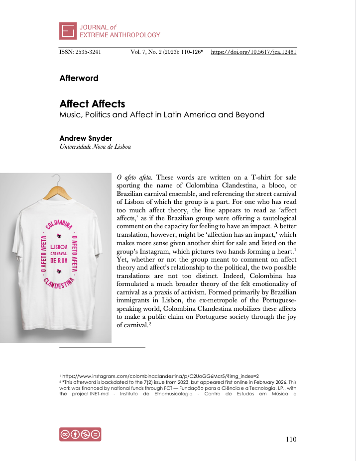 Andrew Snyder, investigador integrado do INET-md, é autor de “Affect Affects: Music, Politics and Affect in Latin America and Beyond“, posfácio do número temático The Affective Politics of Music in Latin America do Journal of Extreme Anthropology, inteiramente disponível em acesso aberto.