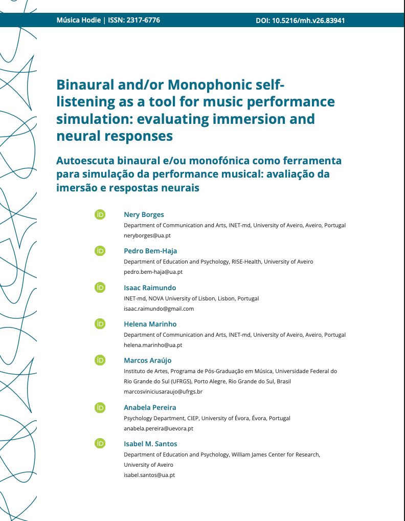 Nery Borges, investigador em doutoramento no INET-md, Isaac Raimundo, investigador em doutoramento no INET-md, Helena Marinho, investigadora integrada no INET-md, Pedro Bem-Haja, Marcos Araújo, Anabela Pereira e Isabel M. Santos assinam o artigo “Binaural and/or Monophonic self-listening as a tool for music performance simulation: evaluating immersion and neural responses”, publicado em acesso aberto na revista Música Hodie.