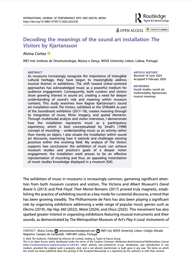Alcina Cortez, investigadora do INET-md, é autora do artigo “Decoding the meanings of the sound art installation The Visitors by Kjartansson“, publicado em acesso aberto pelo International Journal of Performance Arts and Digital Media (Routledge/Taylor&Francis Group).