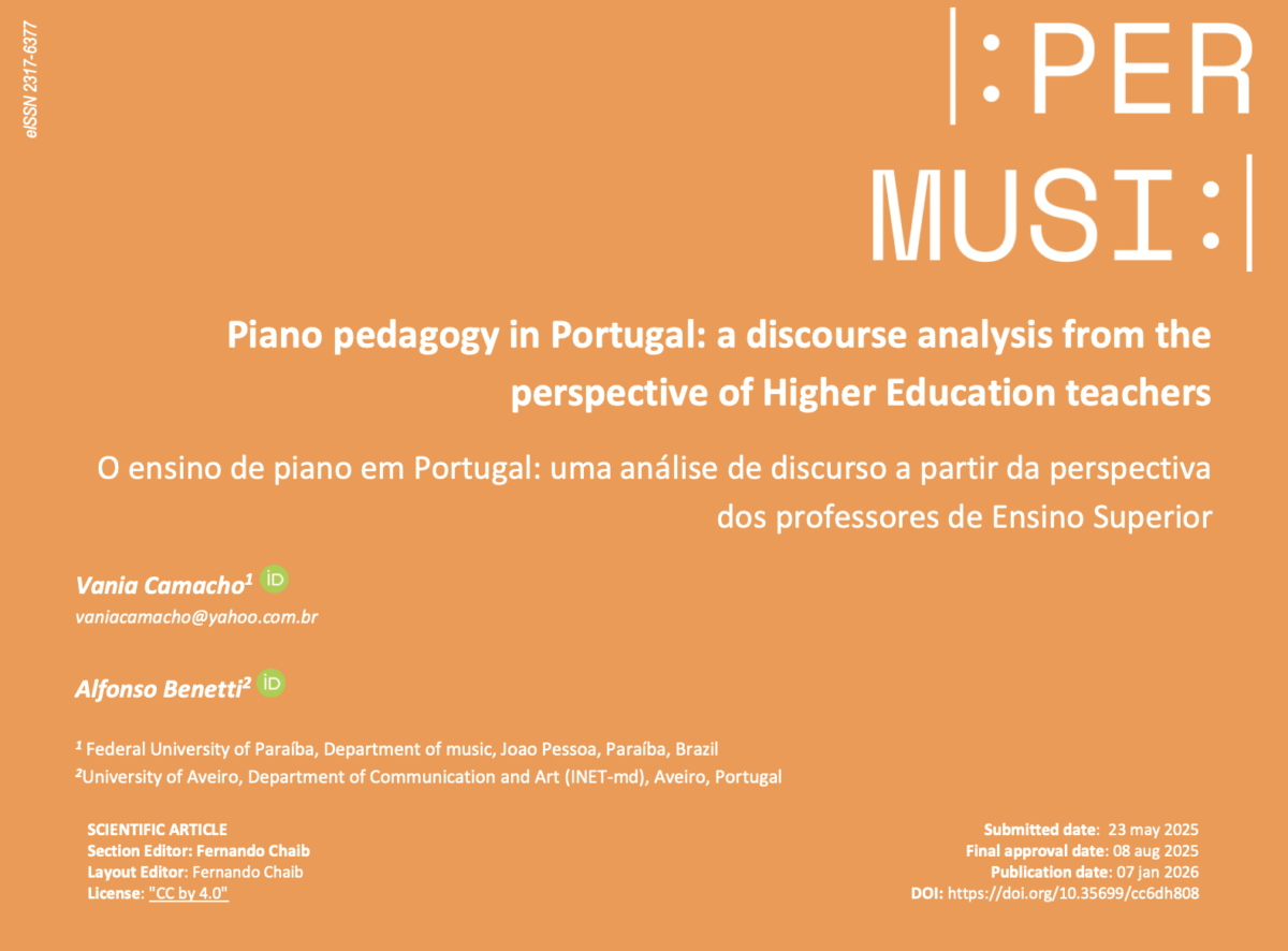 Vania Camacho, antiga pós-doutoranda no INET-md, e Alfonso Benetti, investigador integrado no INET-md, são autores do artigo “O ensino de piano em Portugal: uma análise discursiva a partir da perspectiva dos professores de ensino superior”, publicado em acesso aberto na revista Per Musi.