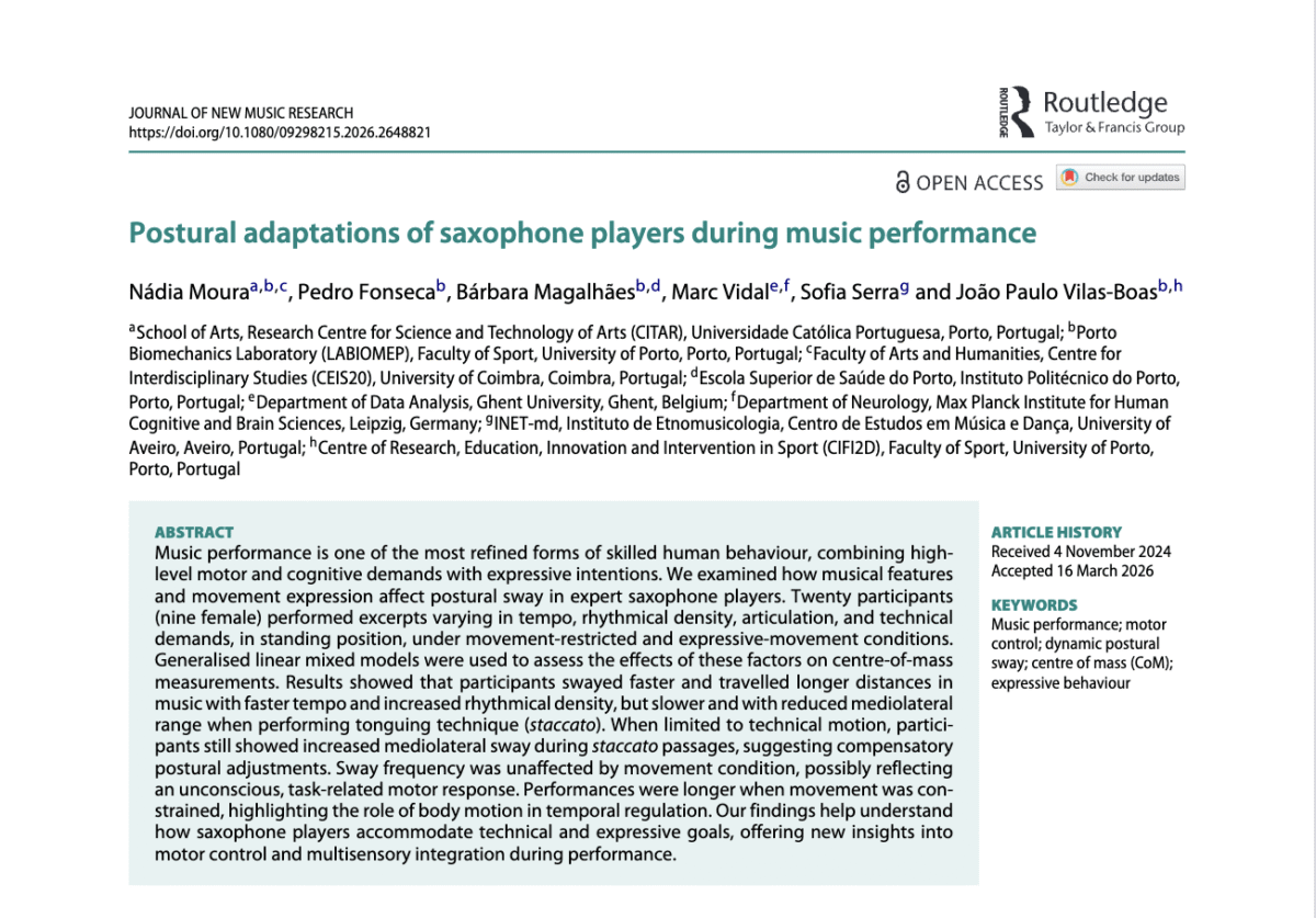 Nádia Moura, Pedro Fonseca, Bárbara Magalhães, Marc Vidal, Sofia Serra (investigadora integrada do INET-md) e João Paulo Vilas-Boas assinam o artigo “Postural adaptations of saxophone players during music performance”, publicado em acesso aberto na revista Journal of New Music Research.