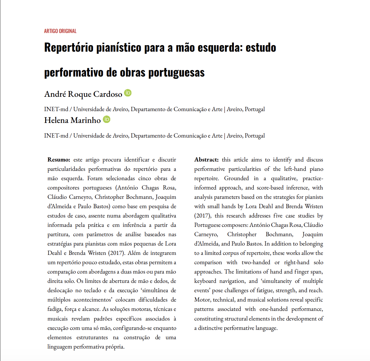André Roque Cardoso e Helena Marinho assinam o artigo “Repertório pianístico para a mão esquerda: estudo performativo de obras portuguesas”, publicado em acesso aberto na revista Vortex Music Journal.